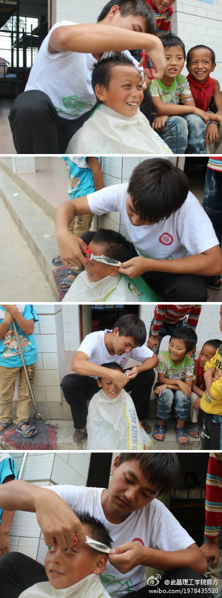 暑假期间,武昌理工学院10名大学生远赴2000公里外的云南省红河州弥勒市新哨镇清河小学义务支教。杨世鑫同学在本次支教活动中担任体育老师一职,而体育课正是孩子们最期盼的课程。一天,在结束基本教学活动后,他组织几个学生打起了篮球。打篮球的过程中,细心地杨世鑫发现一些孩子已经满头大汗,而他们的头发却不是很整齐清爽。原来,为省钱,一些学生家长很少到理发店为孩子理发。曾在自己叔叔开的理发店帮过忙的杨世鑫学过一些理发技能,他敢想敢做,迅速找来了剪刀和梳子,先把孩子们的头发洗干净,就开始给孩子们剪头发。