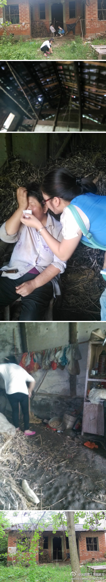 在当地仙桃义工的两位注册成员驱车的带领下,经过了漫长泥泞的小路,终于看到了老人的家。看得见红砖的房子,外面下雨屋内就会漏雨的屋顶,堆满了木柴的大厅,四处支撑的木架,老人眼神空洞的看着远方。