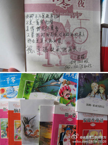 近两日,志愿者进入各栋宿舍楼“卖”书,每本书按标价出售。为保证图书的去向,鼓励捐书同学在书中写上自己的赠言,统一由支教志愿者带给山区的孩子们。来自该校会计1206班的班长洪蝶同学在她所赠送的《一千零一夜》中写道:“不要把时间放在对失败的叹息上,那会是更大的失误,祝幸福快乐成长。”若志愿者有意愿捐赠书目清单上的其他书籍,进行登记之后,相关工作人员利用周末,再次到图书市场购买,并且志愿者的名字和所捐的书籍会张榜公布。
