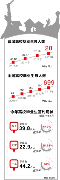 记者从武汉大学、中南民族大学、中南财经政法大学、武汉科技大学、武昌理工学院、华中科技大学武昌分校等本地十余所高校了解到,如果不包含考研、考公务员(事业单位)及出国学生,截至目前,毕业生与用人单位签约率平均不足40%,部分高校甚至不到10%。根据目前形势预估,今年就业率会比去年下降0.5—3个百分点。