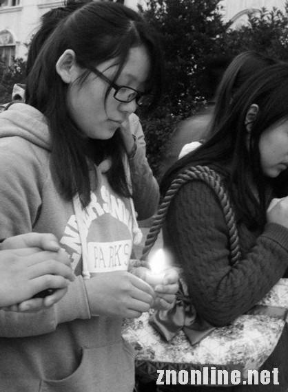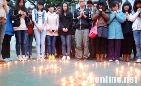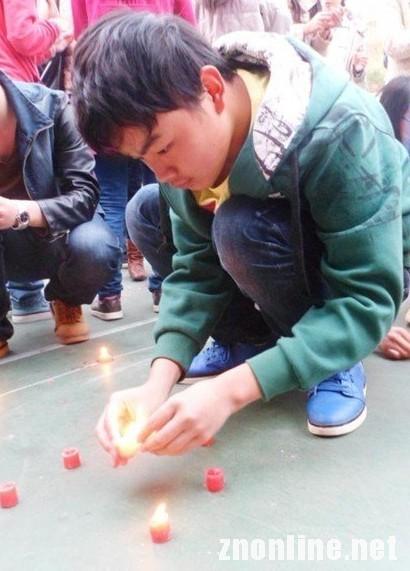 活动现场,学生们一一点亮蜡烛,手捧烛灯低头为雅安地震灾区人民祈祷,随后将蜡烛摆放成一个“心形”图案,中间是一个“420”的字样。每个人的脸上都挂满着悲伤,现场笼罩着失去生命的痛惜哀悼之情。远远望去,黑压压的人群之下是一个个跳动的火苗和“哭泣”的蜡烛。在一声号召下,大家双手合一放在胸前,低头默哀三分钟,为逝去的灾民祈祷。这一刻,没有声音,只有感动。