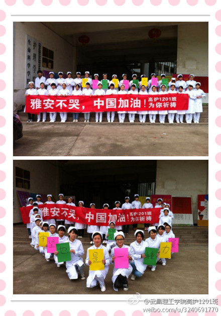 据悉,四川省雅安市芦山县4月20日上午8时2分发生7.0级强烈地震,举国哀痛。该校高护1201班在当天的班会上,经全体同学商议,举行这一祈福活动。黄金救援72小时已过,但心系灾区人民的关切之心依旧不减,祈福的力量依然传递。