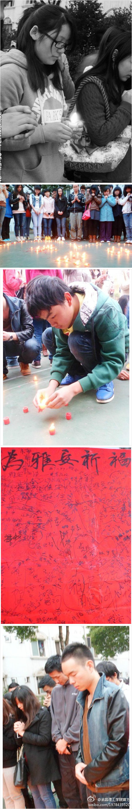“祈福雅安!”“雅安,加油!”“雅安,你要坚强!”“你没有失去亲人,因为我们中华儿女都是你的至亲”!“愿逝者安息,生者坚强!”“我在武汉为你祈福,加油!”……摆放在该校西区篮球场的硕大的“为雅安祝福”画板上写满了过往学生的祈福语录。