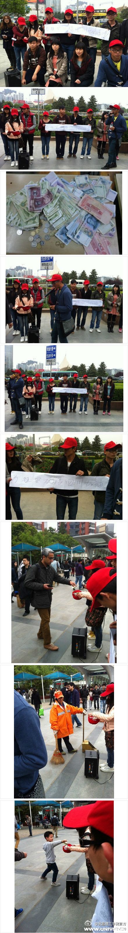 记者在活动现场看到,11名大学生通过演讲的方式募集善款,这一活动吸引了不少路人主动前来捐款。其中一位来自成都的朋友捐出了他身上所有的钱数,尽管只有11元,但他连自己的车费也捐给了家乡的人民。更是有路人捐出400元、500元,其中不乏家长带着小朋友过来捐献的,不少外国友人也过来捐出外币。“一位外国人在募捐活动前看了会,也许他是看不懂我们在干什么。可在有人告诉他后,他跑过来奉献了自己的一份爱心。”在每一位路人捐赠完后,该队的成员们都会对其深深地鞠上一躬,真挚地说一声“感谢”,这一场面尤其感人。