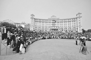 人数最多的是商学院,944名毕业生加上校领导和教职工,1000余人只能排成半圆形合影。为了拍这张集体照,学校提前一天搭好了台子。由于人数众多,连摄影师都颇为感叹,花了近20分钟才拍好。