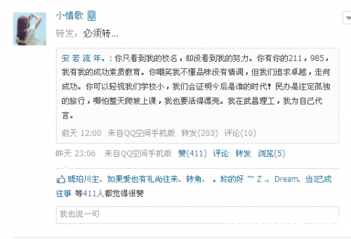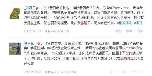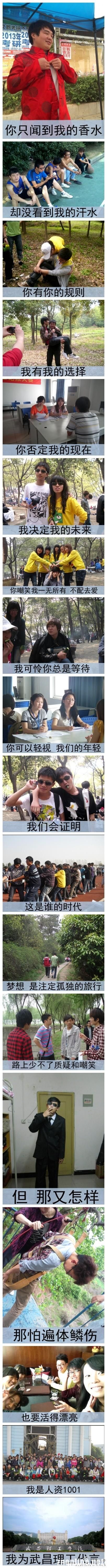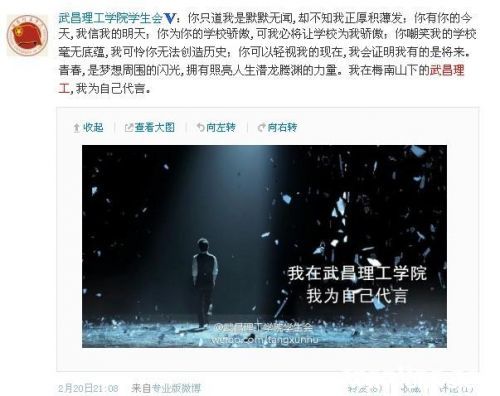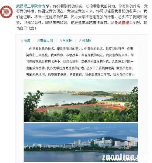 “你只看到我的校名,却没看到我的努力。你有你的211,985,我有我的成功素质教育。你嘲笑我不懂品味没有情调,但我们追求卓越,走向成功。你可以轻视我们学校小,我们会证明今后是谁的时代!民办是注定孤独的旅行,哪怕整天爬坡上课,我也要活得漂亮。我在武昌理工,我为自己代言。”在网友“安若流年”的空间里,这条武昌理工学院版的陈鸥体在不到两天的时间里被赞411次,转发200多次。网友“做一个低调的孩子评”论道:“起点低也能飞的高,我在武昌理工,我骄傲!”在另一个该校官方微博版本中也迅速引发热议和追捧:“你只看到我的校名,却没看到我的努力。你有你的排名,我有我的特色,你嘲笑我们三本高校,我可怜你,不敢改革。你否定我的现在,我决定我的未来。你可以轻视我目前的名声小,我们会证明,这是厚积薄发的时代,武昌理工学院一定能成为品牌。民办大学注定是孤独的行者,总少不了质疑和嘲笑,但那又怎样,哪怕未来坎坷,也要追求卓越、勇往直前。我是武昌理工学院,我为自己代言!”记者了解到,仅武昌理工学院就有近十个版本的“陈欧体”广为流传,该校学子争相接龙为学校代言。