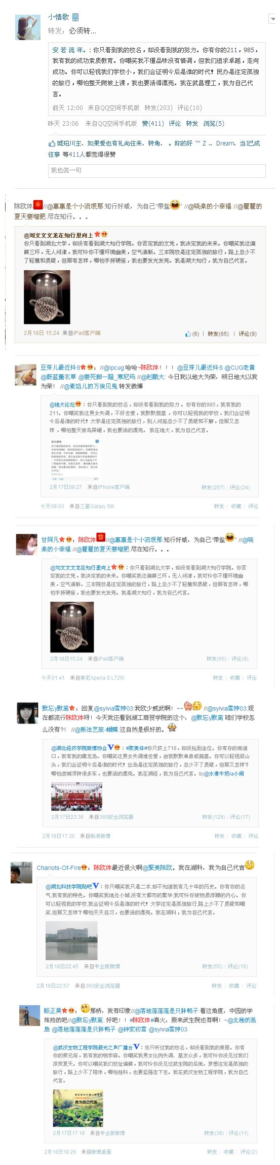 武汉部分高校“陈欧体”版本:“你只看到我的校名,却没看到我的努力。你有你的211,985,我有我的×××……我在××学校,我为自己代言。”近日,不少大学版的“陈鸥体”微博在网上蹿红,网友纷纷编写和转发具有本校特色的“陈鸥体”为自己学校“代言”,引起很多大学生的热议和共鸣。
