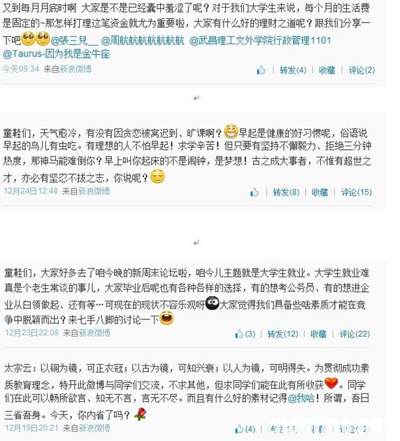 除了学生参与其中外,学校的素质导师们也都关注了学院里的成功内省微博。“通过在微博里参与学生们讨论的话题,一可以充分了解学生们的心理状况,同时也能够适时的进行引导,是个一举多得的事情。”素质导师刘玲莉经常参与该院成功内省微博的互动。