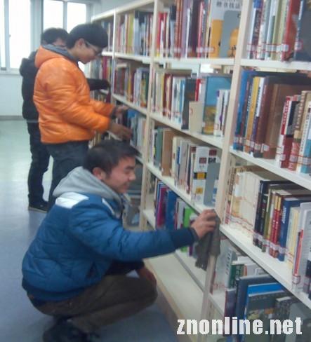 记者看到,他们活动在各个书架之间,手里拿着抹布,小心翼翼的整理书籍并擦拭书籍以及书架上的灰尘。虽然是冬至但有的同学已经流下了汗水。组织这次活动的主要负责人陈畅说:“图书馆这么大,书籍和书架上的灰尘又很多,仅仅靠老师们打扫实在是太累了,所以就过来帮一下老师们的忙。”打扫卫生的同学们忙的不亦乐乎。来自网络工程1001班的王莹说:“书架桌子干净了,看着很舒服。作为积极分子做点义务劳动是应该的,气氛也很和谐,今天虽然累,但依然很高兴。”
