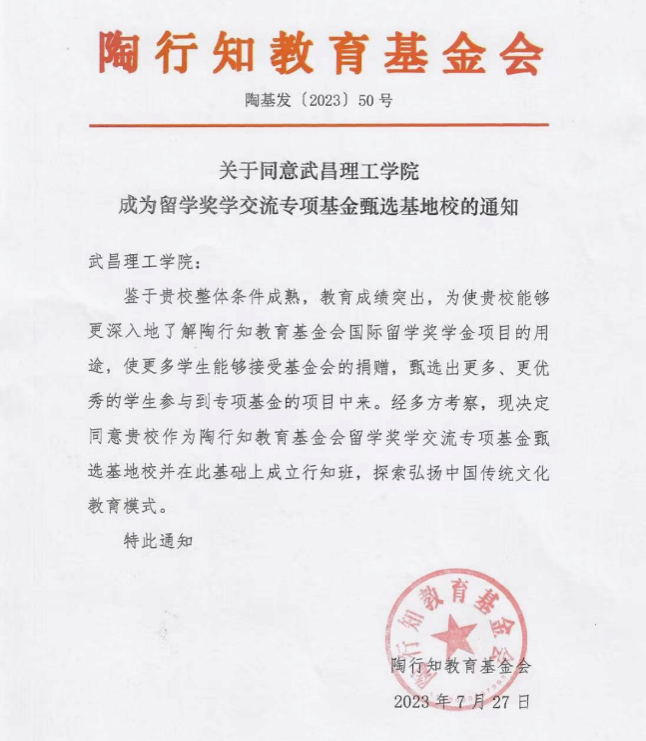 “鉴于贵校整体条件成熟,教育成绩突出,为使贵校能够更深入地了解陶行知教育基金会国际留学奖学金项目的用途,使更多学生能够接受基金会的捐赠,甄选出更多、更优秀的学生参与到专项基金的项目中来。经多方考察,现决定同意贵校作为陶行知教育基金会留学奖学交流专项基金甄选基地校并在此基础上成立行知班,探索弘扬中华优秀传统文化教育模式。”近日,武昌理工学院收到陶行知教育基金会通知,同意武昌理工学院成为留学奖学交流专项基金甄选基地校。