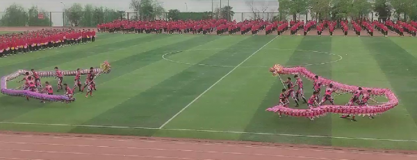 在书记指挥声中、伴随着音乐,首先向主席台走来的是运动员方阵。他们中间每个队都代表着不同学院,他们每个人都为自己学院为自己班级而战。其次出场的便是来自人工智能学院的花扇方阵的同学,音乐响起,全员纷纷拿起花扇,随着音乐飞速换着对应颜色。所有颜色组合在一起便变成了图案。紧接着便是团体操,他们参加学院有文法学院、健康与护理学院、商学院。花球随着节奏的晃动昭示着青春与活力。最后伴随着古风、让人联想到江湖决斗的伴奏中舞龙队出场了,彩带龙队是智能建造学院大一男生的主场。