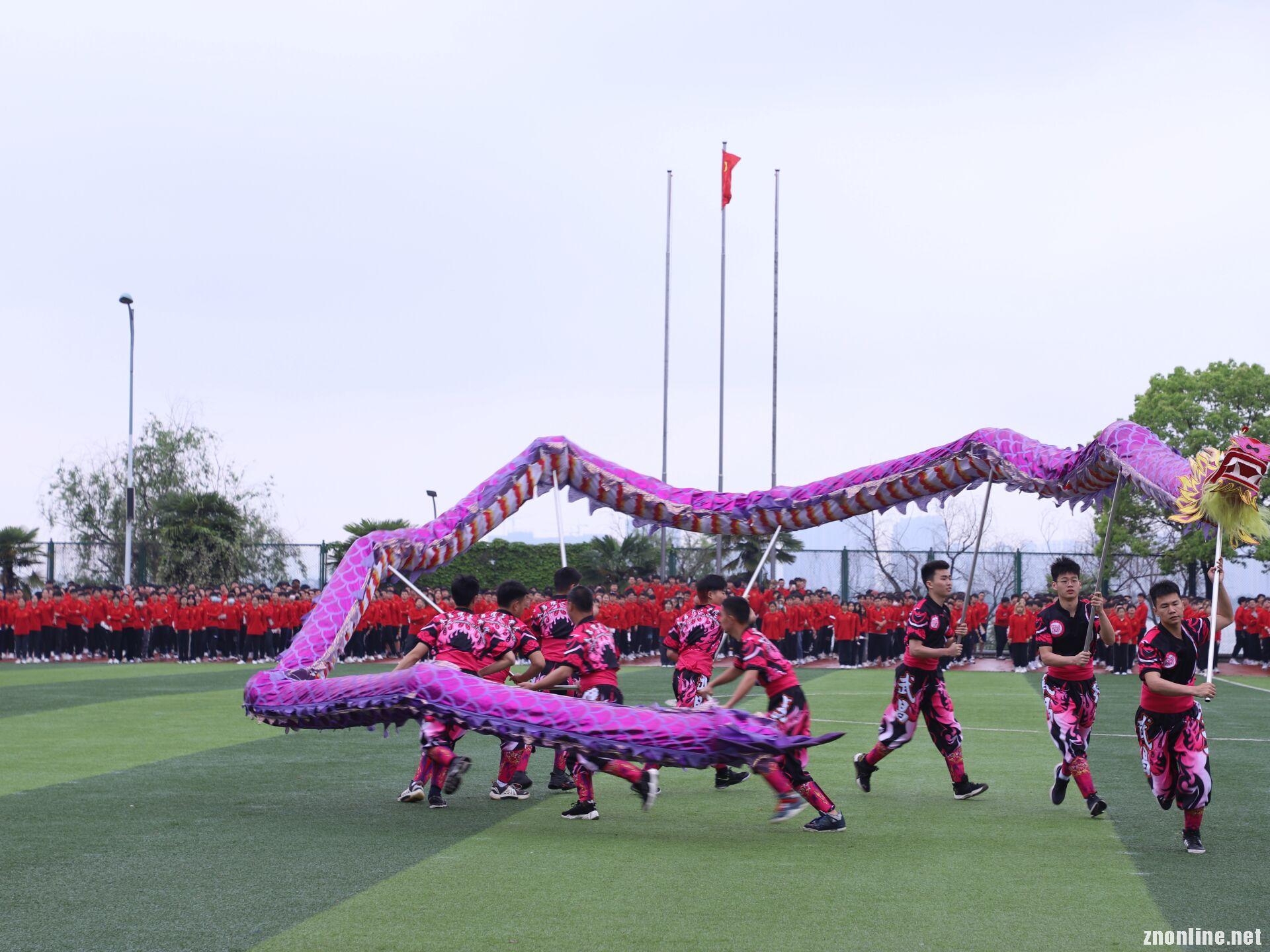 在学校董事长彭元杰教授“醒狮点睛”后,激盎的锣鼓声响起,鼓声沉沉,巨龙盘旋舞动,运动场上的102条舞龙格外引人注目,绿茵操场上,彩带龙,粉紫黄三种颜色交织在一起,欢腾跃动,引来观众席上掌声阵阵,继而伴随传统音乐的旋律,一百条彩带龙合着节拍,不断盘旋飞舞,舞龙队员们或高举龙身让龙呈腾空状,或盘旋折叠或围绕呈圆形不停旋转,穿腾、翻转、跳跃、奔跑等动作行云流水一气呵成,身手矫健的舞龙队员们把龙舞得活灵活现,极具感染力和观赏性引得观众纷纷欢呼,现场气氛达到了高潮。