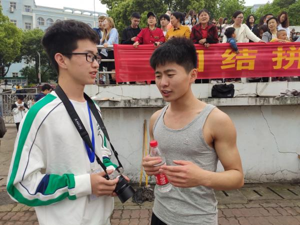 赛后记者采访到了陈飞飞同学,他虽然已经非常疲累,但是依然愿意和同学们分享经验。他说:“我本来就重视这次比赛,所以赛前也一直有训练,加上我自己还参加了舞龙队的训练,所以才能跑出小组赛第一的成绩。希望接下来的比赛可以继续保持状态,也希望参加其它项目的同学可以创造佳绩”。(完)