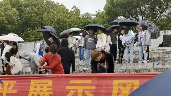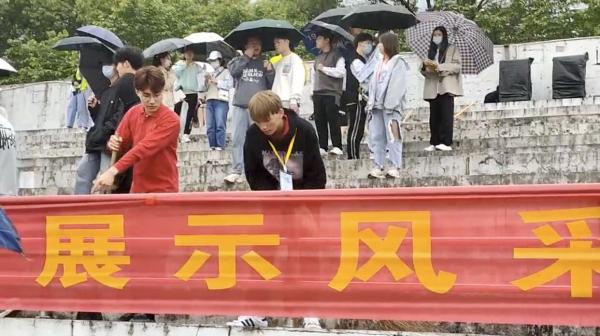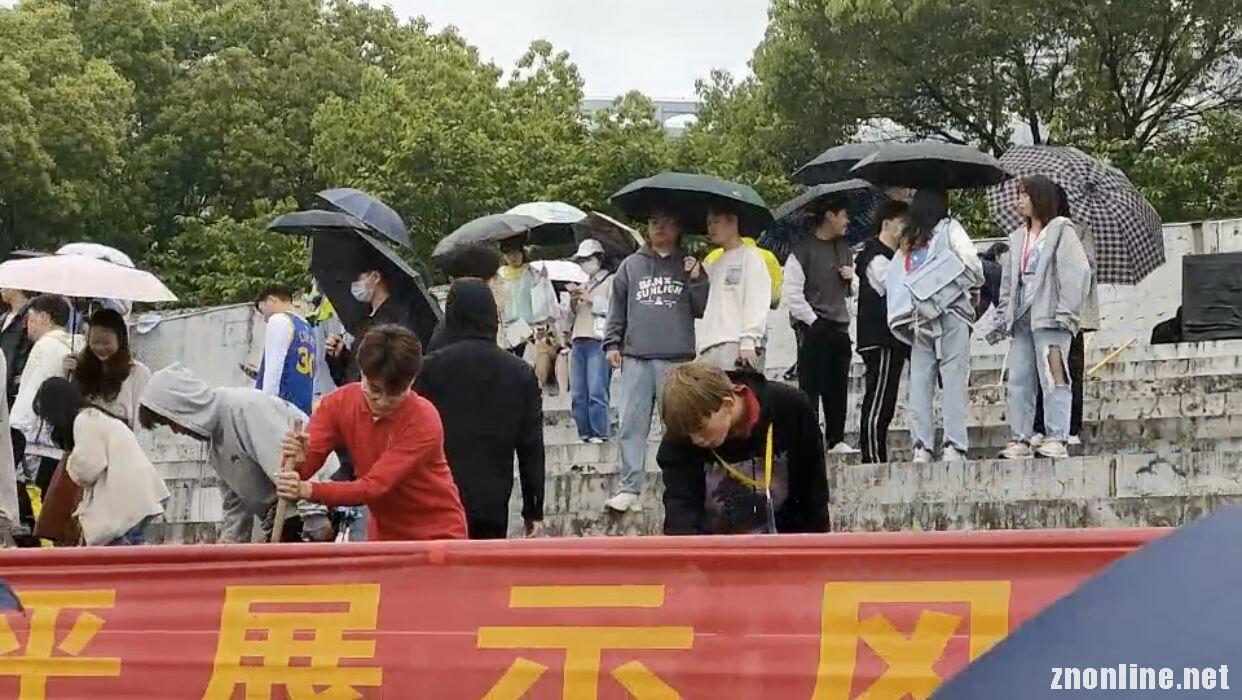 盛逢武昌理工学院第十七届运动会,在运动会起始,虽风雨凌厉,但运动会仍照常举行。为了给全校师生创造整理明丽的校园环境,文法学院在雨中打扫看台。