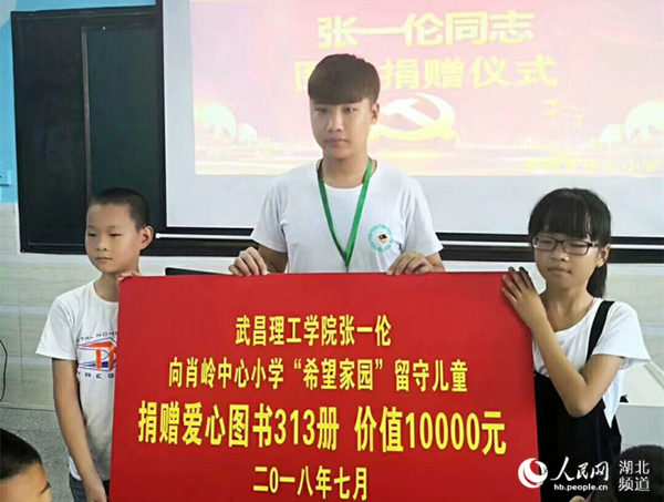 看到山村留守儿童对读书的渴望,他决定省吃俭用为这里捐赠一所小型图书馆。7月15日,湖北咸宁市崇阳县肖岭中心小学一场特殊而又暖心的图书捐赠仪式正在举行,武昌理工学院大学生张一伦现场捐赠了300余册图书,总价值1万元。