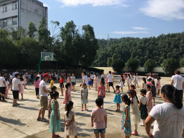 现阶段学生身体素质较差,缺乏锻炼。为了让学生养成强健的体魄与良好的习惯,该团队开设了趣味课间锻炼活动。听到下课铃声,孩子们迫不及待的冲向操场,排成整齐有序的队形等待着老师下达口令。支教队员们将孩子们分成小组,双手搭在前面同学的肩膀上,围成一个个圆圈,随着音乐的响起,简单有趣的“兔子舞”开始了。支教队员们大声喊着节拍:“左!左!右!右!左!右!跳跳跳!”整个操场上充满了孩子们的欢声笑语,大家在操场上开心的挥洒着汗水。