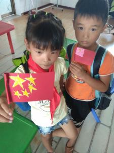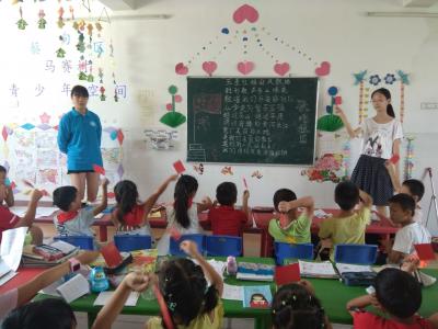 课中,志愿者杨莹首先播放音频《五星红旗迎风飘扬》,邀请学生中会唱的跟着一起唱,激发学生们对五星红旗的兴趣。然后教授学生们唱这首歌。三年级的朱师瀚笑着对老师说:“这首歌唱的是五星红旗,就是说我们的祖国会越来越好。”