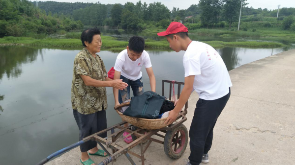 在调研分队队员们返回涢阳小学路途中,队员周宇轩发现在不远处的河边有一位老奶奶正在向他们招手,队员们立刻跑了上去,发现老奶奶即将昏倒在河中,调研分队队长甘露顺势将老奶奶拉入怀中,这才使得老奶奶没有摔倒在河里。原来老奶奶是来河边洗菜,因年迈已高身体不适,所以险些昏倒。队员们担心老奶奶的身体,一直陪着老奶奶在树下谈心休息。等到老奶奶体力恢复后,队员们又帮老奶奶把衣物和蔬菜放到推车上,并护送老奶奶回家。一路上,队员们都陪着老奶奶聊天,看着老奶奶丝毫没有了身体不适的样子,队员们悬着的一颗心也逐渐放了下来。