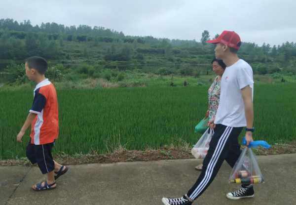 在调研队员们实践调研路途中,迎面走来了一位步履阑珊的老人以及一位刚上小学的小朋友,他们手中提着的是一些生活必须品,实践队员们礼貌地上前问好并介绍了调研团队的来意,在询问到他们回家的路程遥远,山路崎岖后,调研队员们热心的接过他们手中的袋子,将他们送往家中。老人也向调研队员们表示感谢。