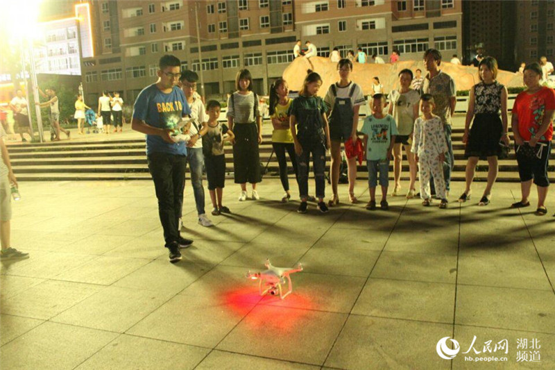 人民网通城7月16日电 夏夜里小镇居民纷纷出来纳凉散步,在湖北省通城县沙堆镇的广场上人头攒动,节奏感十足的音乐也回荡在场地四周,但近几日的广场舞却不及平时热闹,原来是人们都围着一群“创客大学生”,被他们手中炫酷的无人机和机器人所吸引。