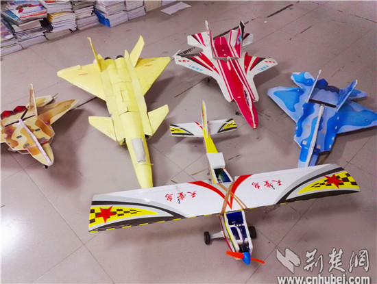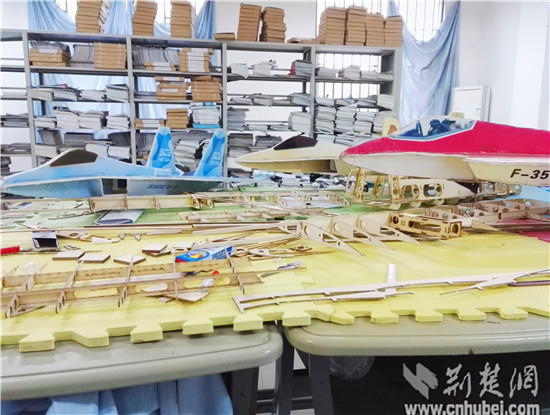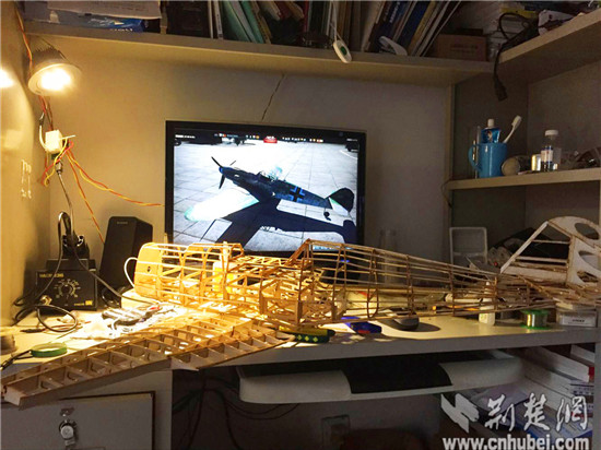 记者参观了航模协会的工作室,发现到处都堆满了做航模所需要的材料,有纸板、胶水、工作板、三角尺、电线等,还有孟浩江已经做好的几架航模飞机。在孟浩江寝室里,记者也发现了几架已经做好的精致的模型飞机,有一架kt板材制作的F22、一架轻木材料的BF109、一架四旋翼机F450以及一架四旋翼穿越机GT250。他的室友熊志威讲述,平常孟浩江在制作航模时,一做就停不下来,有时甚至连着五个小时对着图纸写写画画,对着航模的内外细节修改了一遍又一遍。