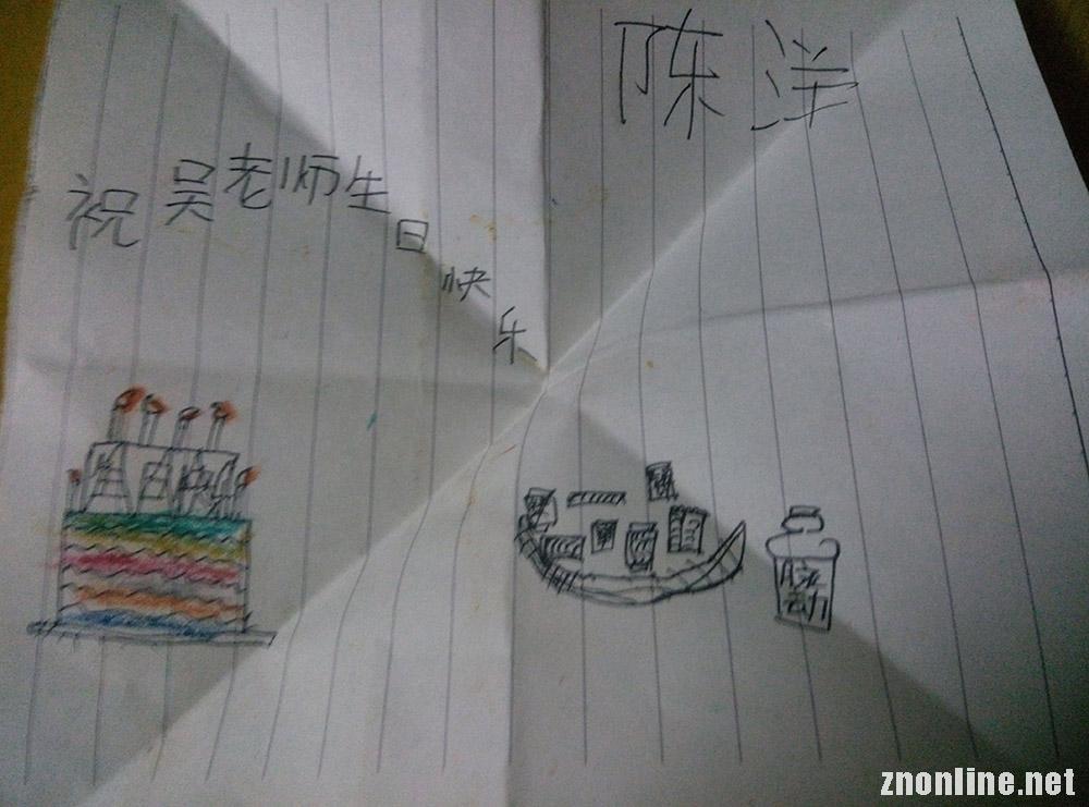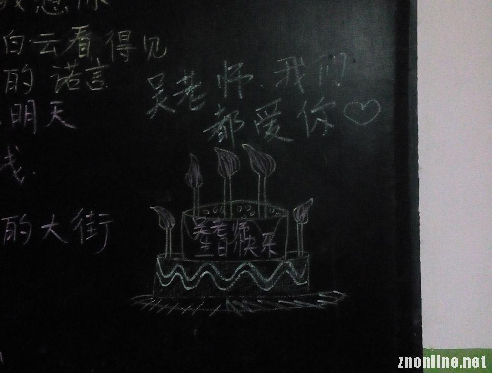 7月21日,吴老师和平常一样地进行下点教学,并没有告诉学生们今天是他的生日。可他不知道,放学后与他同行的杨老师已经暗自地与学生们在空闲的教室里为他准备着生日礼物。下午6时,当吴老师在几名学生的引导下走进了教室,顿时,就听到孩子们为他齐唱生日歌。教师的黑板上画着大大的蛋糕,上面写着“吴老师,我们都爱你!”。之后,学生们纷纷将自己亲手画出来的礼物递给了他。