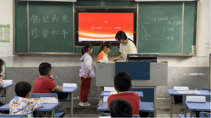 活动中,通过讲解事变经过,呈现“日军借口搜查”“中国士兵拒敌”等情节,队员们提出的互动问题引发孩子们的齐声回应,现场气氛热烈。为加深理解,课堂设计了“保卫宛平城”角色扮演游戏。孩子们分组扮演中国士兵、老百姓和日本军官,重现历史场景。“士兵”挺胸拒绝无理要求,“老百姓”齐声呐喊守护家园。游戏结束后,支教队员引导总结:“对敌人说‘不行’是保护家园的第一步,只有团结才能赢得胜利!”