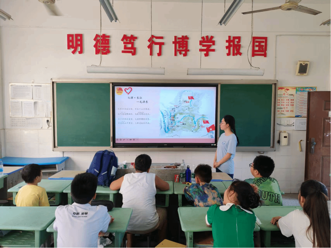 中南在线7月7日消息(大通社记者 郭姿彤 报道)在新时代加强青少年爱国主义教育的背景下,为引导乡村学生认识长征历史、感悟革命精神,武昌理工学院第六届知行书苑支教队“文润童心·法护青禾”志愿服务团于7月7日在天门市干驿镇干驿小学,面向在校学生开展长征主题课程教学。团队充分发挥专业优势,通过多媒体资源整合与沉浸式教学模式,精心设计课程内容,力求以生动鲜活的形式系统呈现长征历史脉络,帮助学生在学习中筑牢信仰根基,让长征精神在青少年心中生根发芽,为培养担当民族复兴大任的时代新人贡献力量。