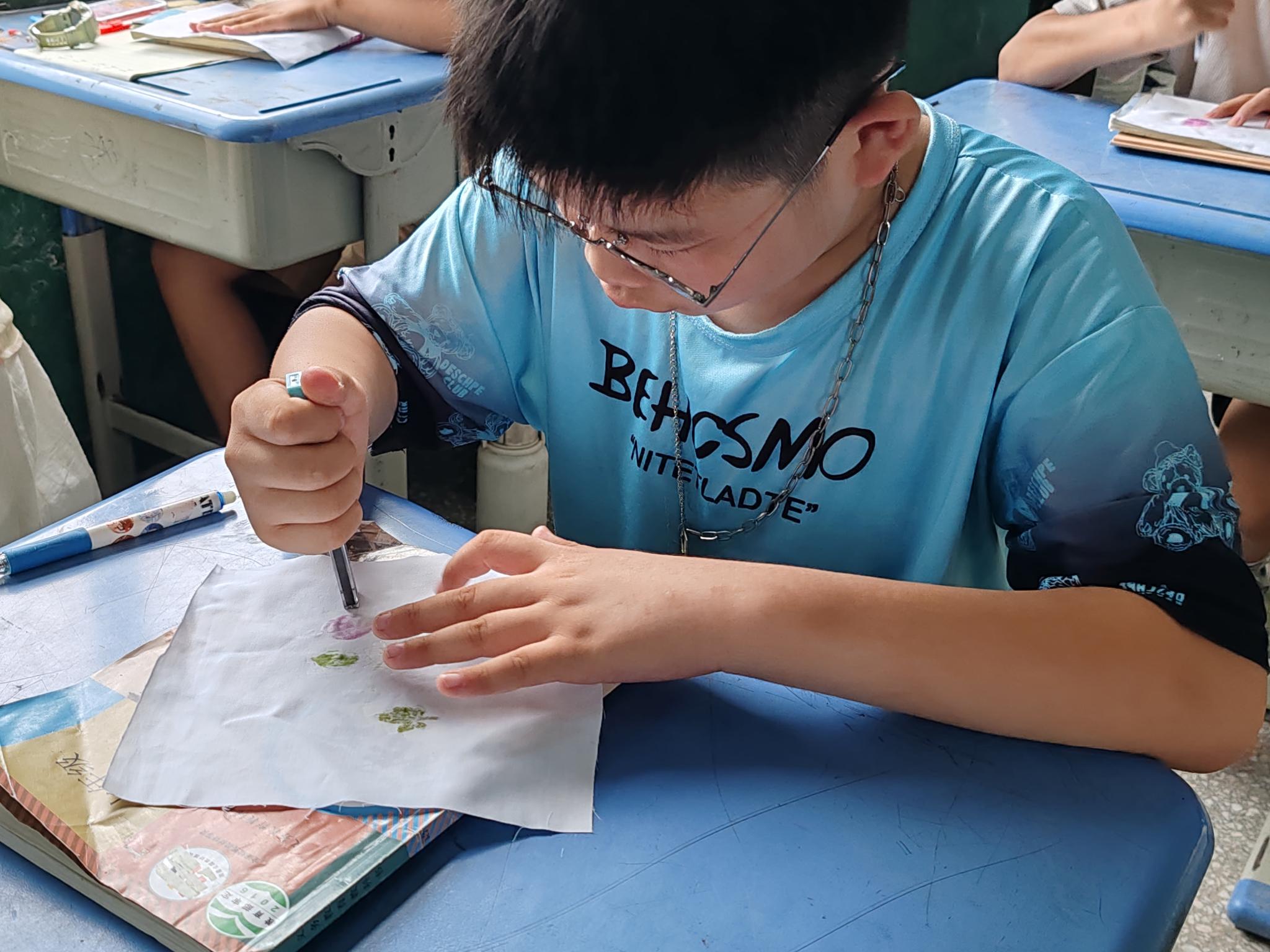 进入实践环节,孩子们拿起笔,按照指导轻轻敲击白布。随着“咚咚”的敲击声,花瓣的轮廓、枝叶的纹理逐渐印在白布上,原本空白的布面慢慢呈现出自然的形态十分鲜明。过程中,段老师巡回指导,提醒孩子们控制敲击力度以保证图案完整。活动室里不时响起“我的作品成啦”的欢呼,草木的清新气息与孩子们的笑语交织,每幅作品都带着自然的独特印记,充满童真与创意。