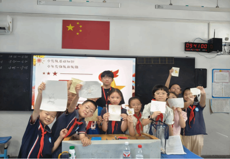 为了巩固学生对少先队与共青团知识的掌握,班会开展了少先队知识竞赛。竞赛内容涵盖了少先队与共青团的相关基础知识,如队徽的含义、队礼的由来、共青团的成立时间等。学生们积极参与,踊跃答题,在竞赛中加深了对少先队与共青团知识的理解和记忆。课堂互动环节,学生们在辅导员老师的指导下,行少先队礼,画少先队队徽。通过亲身实践,学生们更加深刻地体会到了少先队礼仪的庄重与神圣,进一步增强了对少先队组织的认同感和归属感。