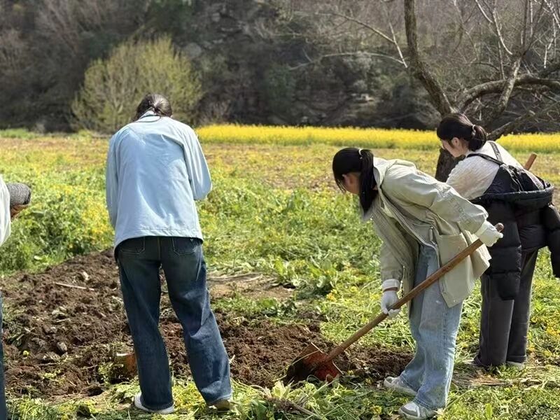 同学(原声):“以前我觉得农田就是像插画里的样子,真正地握着锄头去地里除杂草、栽树苗,才发现农事其实比想象的更加的辛苦,当然也是非常的有趣。我们这次是栽树苗这种沉浸式的体验,我觉得是特别有意义的。”